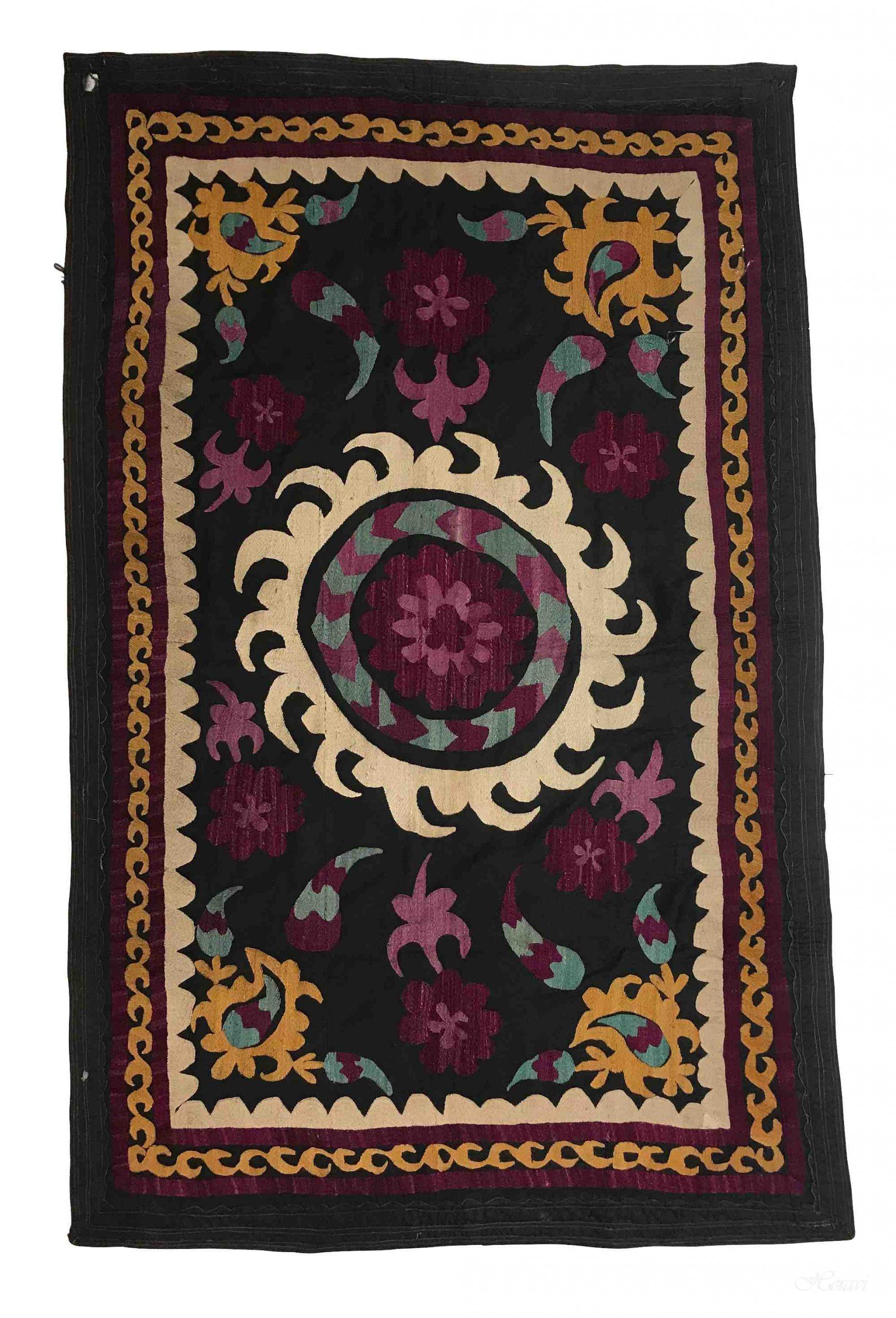 RARO TESSUTO IN SETA E COTONE CON RICAMI A MANO E FIRMA DELL’AUTORE, DELL’ASIA MINORE. MANUFATTO DETTO “SUZANI” DAI MOLTEPLICI USI DA CENTRO TAVOLA, USO ARAZZO …